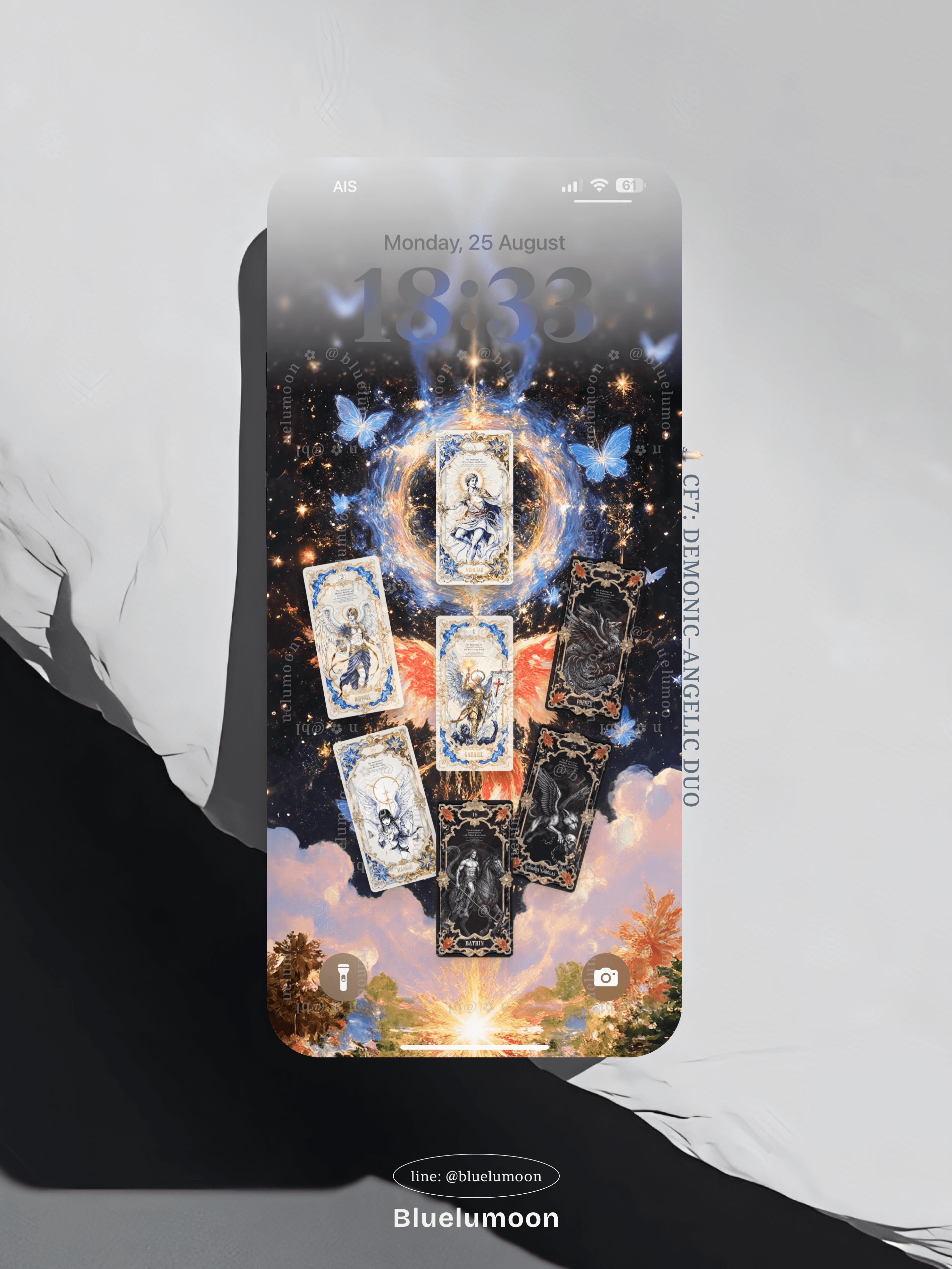 ลองนึกภาพตามบลูนะคะ วอลเปเปอร์ CF7 คือการออกแบบสนามพลังงานที่ท้าทายและลึกซึ้งที่สุด บลูจะเลือกพลังงานจาก Angelic Realm (ฝ่ายเทพ) ซึ่งเป็นตัวแทนของเป้าหมายอันสูงส่ง เจตนาที่ดีง และความสมดุล มาจับคู่กับพลังงานจาก Goetia หรือ Demonic Realm (ฝ่ายปรัชญาด้านมืด) ที่เป็นตัวแทนของพลังขับเคลื่อนดิบ (Raw Power), ความปรารถนาที่ซ่อนลึก, หรือเงาที่เราต้องเผชิญหน้า