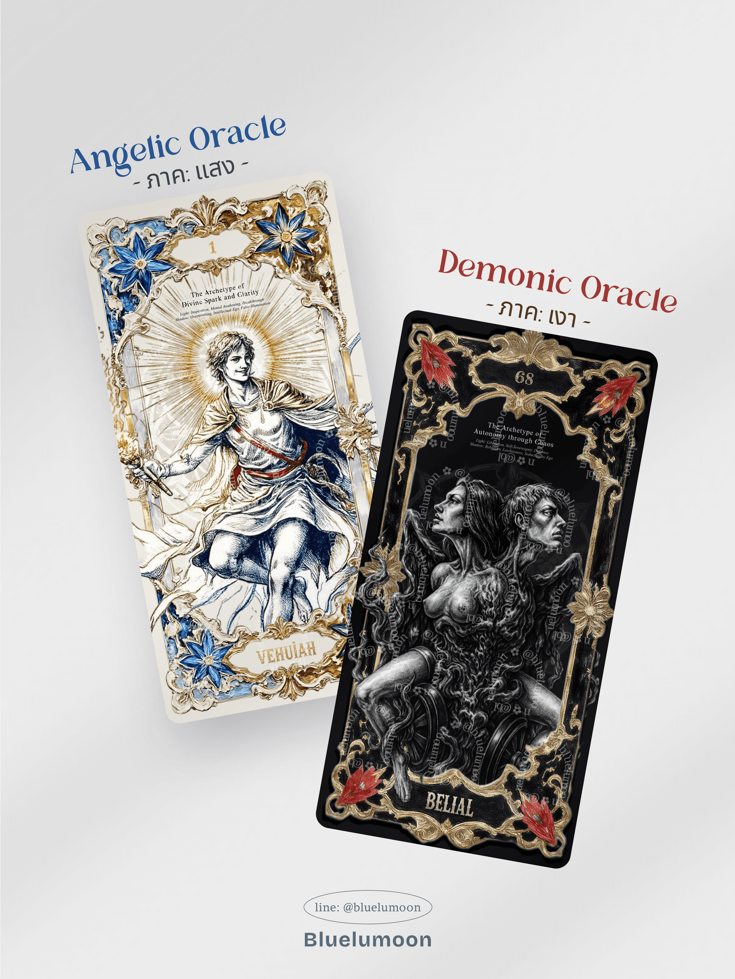 🕊️ Angelic Oracle (72 ใบ): ภาคแสงสว่างตัวแทนพลังงานด้านบวก พลังแห่งการเยียวยา ศักยภาพสูงสุดที่เราอยากจะเป็น เหมือนเสียงกระซิบจาก Higher Self ของเรา ไพ่ชุดนี้จะสะท้อน Archetype (ต้นแบบ) ของผู้ชี้นำ, วีรบุรุษ, หรือพลังบริสุทธิ์ในตัวเรา เพื่อให้เราเห็นว่า “ฉันก็เป็นแบบนี้ได้นี่นา”