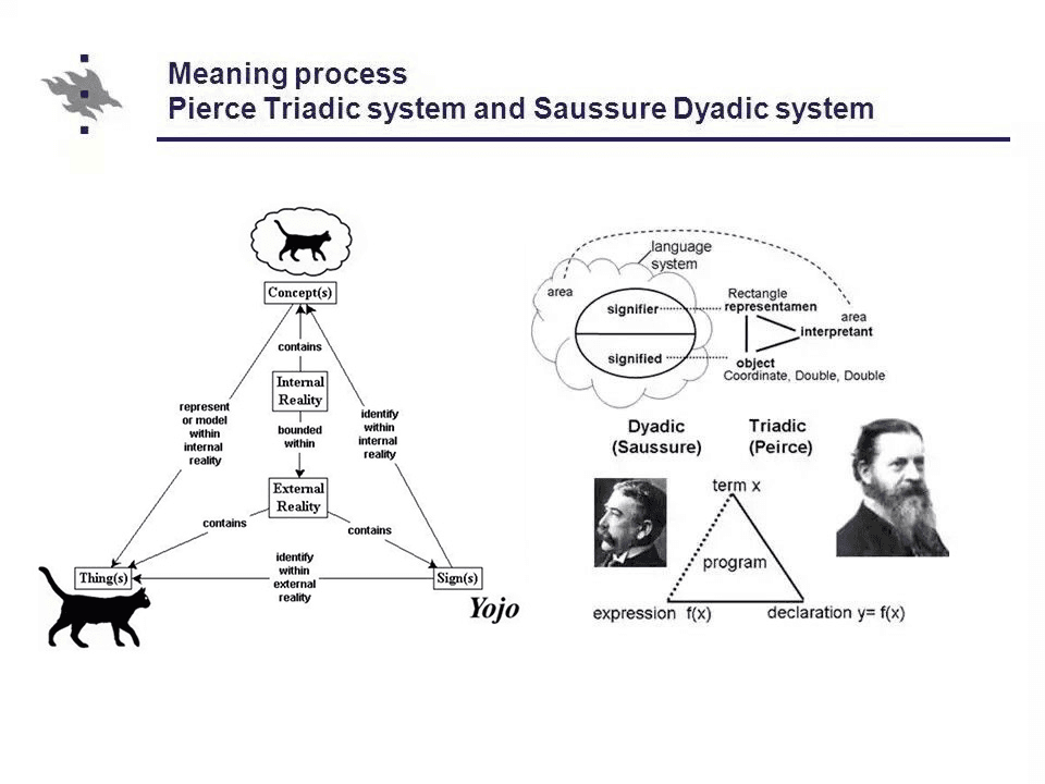 นี่คือจุดที่บลูอยากชวนทุกคนมารู้จักกับแนวคิดของ Charles Sanders Peirce นักปรัชญาที่มองว่ากระบวนการสร้างความหมายมันไม่ใช่แค่ 1+1=2 แต่มันเป็นสามเหลี่ยมแห่งพลัง หรือที่เรียกว่า Triadic system ค่ะ