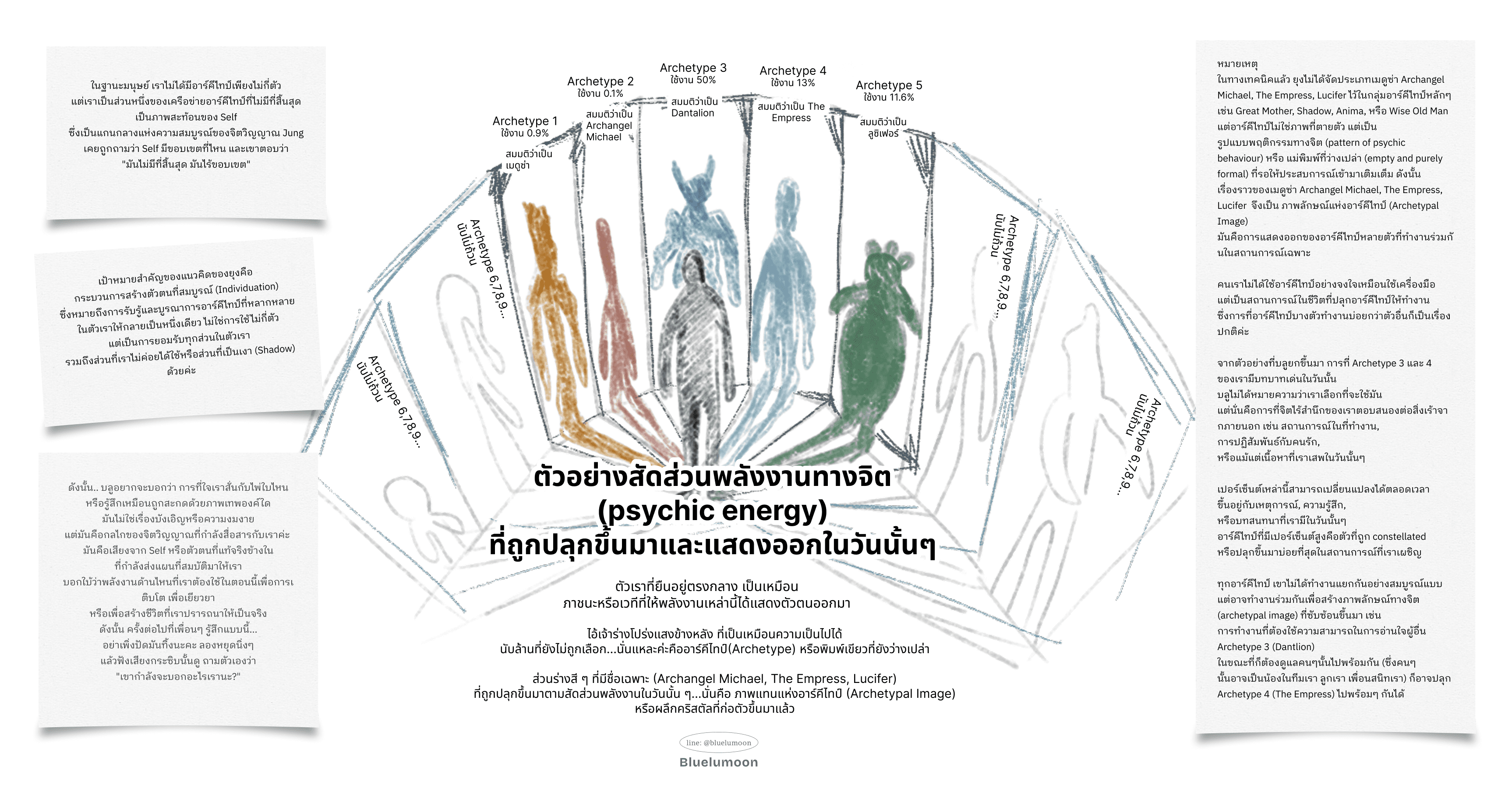 ... อาร์คีไทป์เรามองไม่เห็นมันตรง ๆ แต่เมื่อมันถูกใช้งานผ่านประสบการณ์และวัฒนธรรมของเรา มันก็จะก่อรูปออกมาเป็นผลึกภาพแทนแห่งอาร์คีไทป์ (Archetypal Image) ที่มีหน้าตาและสีสันแตกต่างกันไป นับล้านรูปแบบเลยค่ะ