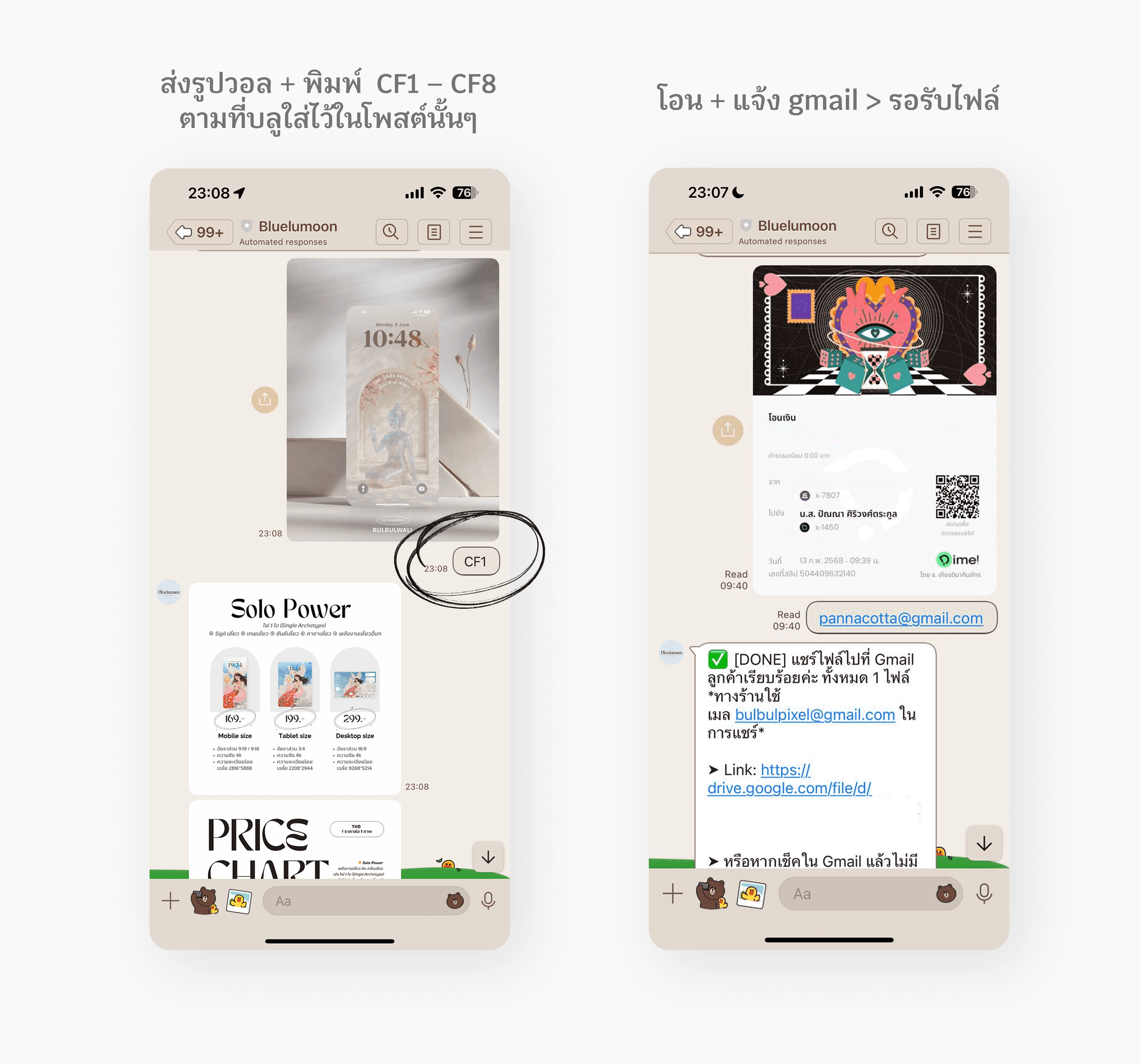 3.ชำระเงิน > ส่งสลิป + Gmail ที่ต้องการใช้รับไฟล์ภาพมาในแชทไลน์